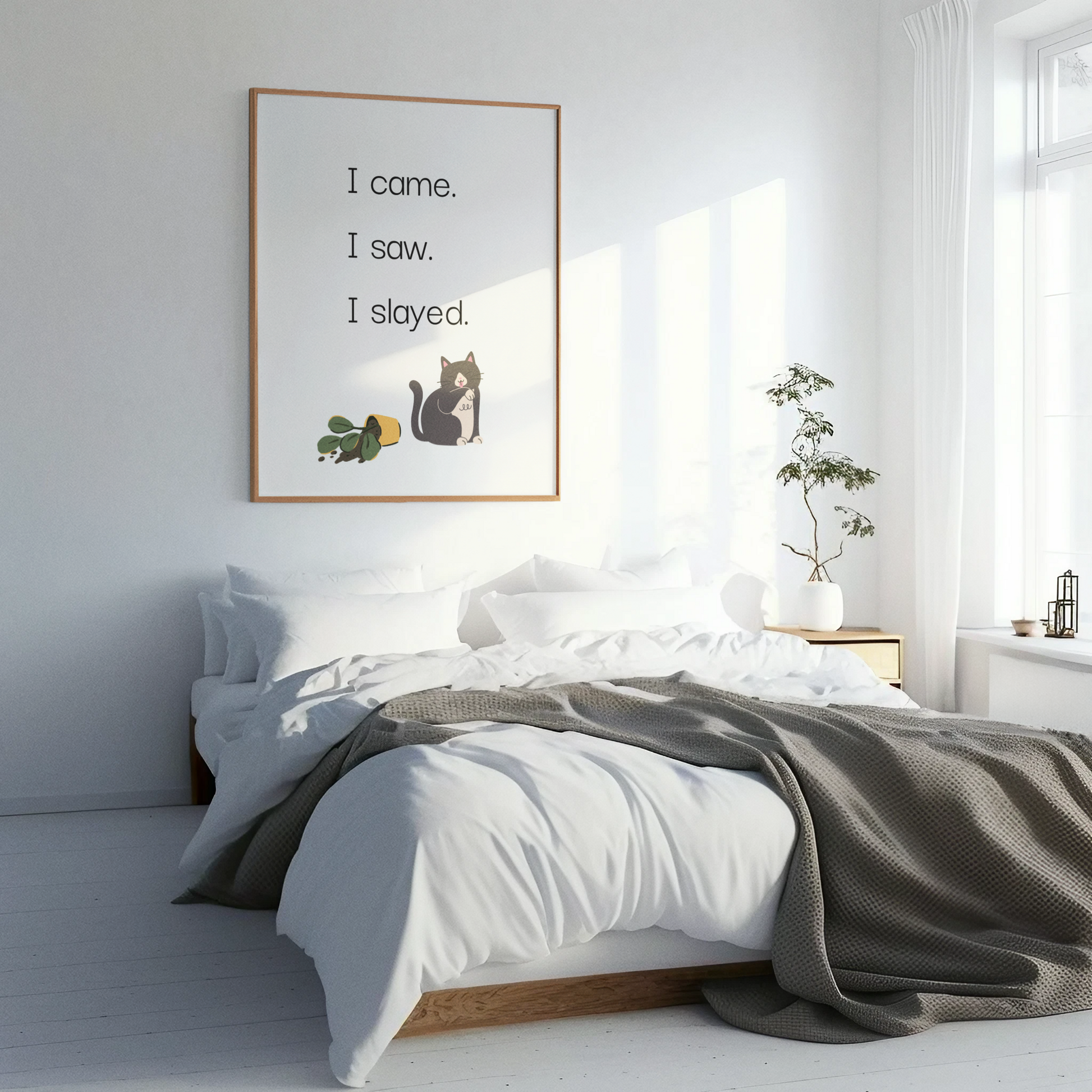 Capture the mischievous charm of cats with this bold and stylish digital wall art! Featuring a sleek feline nonchalantly licking its paw beside a toppled plant pot, this piece perfectly embodies the confident, unapologetic attitude that all cat lovers know and adore. With the cheeky phrase "I came. I saw. I slayed." elegantly displayed, this artwork is a must-have for those who appreciate a little feline flair.