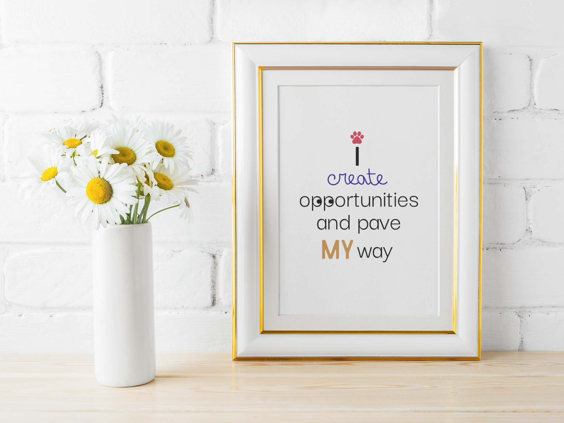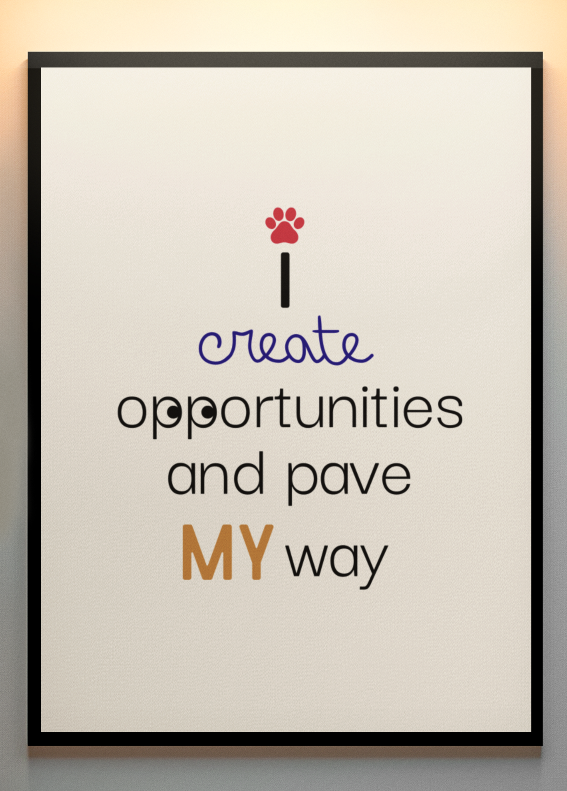 Forge your own path with this bold and inspiring digital wall art! Designed with quirky, playful fonts and a paw print replacing the dot on the ‘i’, this piece is perfect for go-getters, dreamers, and anyone who believes in making their own luck. Whether you're chasing goals, building dreams, or just adding a fun touch to your space, this artwork is a daily reminder that success is something you create—one paw step at a time.